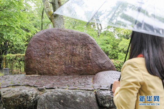 4月28日,在日本京都嵐山,一名游客欣賞“周恩來總理紀念詩碑”。 新華社記者 杜瀟逸 攝 通訊:“大江歌罷掉頭東”——追尋周恩來的留日印跡 這是4月28日在日本京都拍攝的雨中嵐山一景。