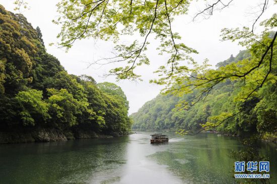 這是4月28日在日本京都拍攝的雨中嵐山一景。